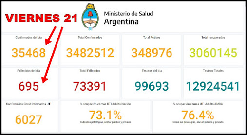 Confirmaron 695 nuevas muertes y 35.468 contagios en las últimas 24 horasEl Ministerio de Salud de la Nación informó que se realizaron 99.693 testeos, con un 35,57% de positividad. Con estas cifras, el total de infectados asciende a 3.482.512 y las víctimas fatales son 73.391